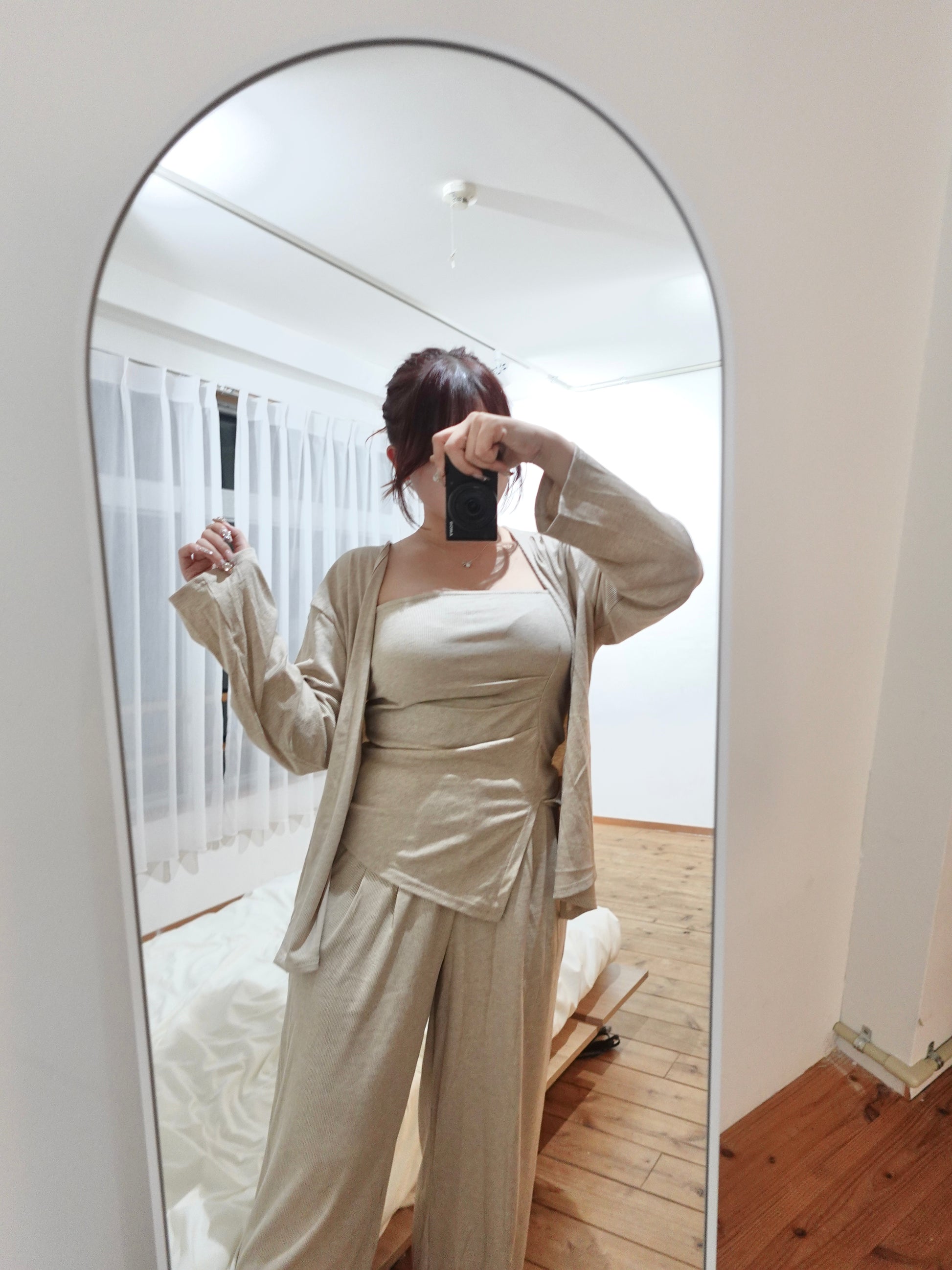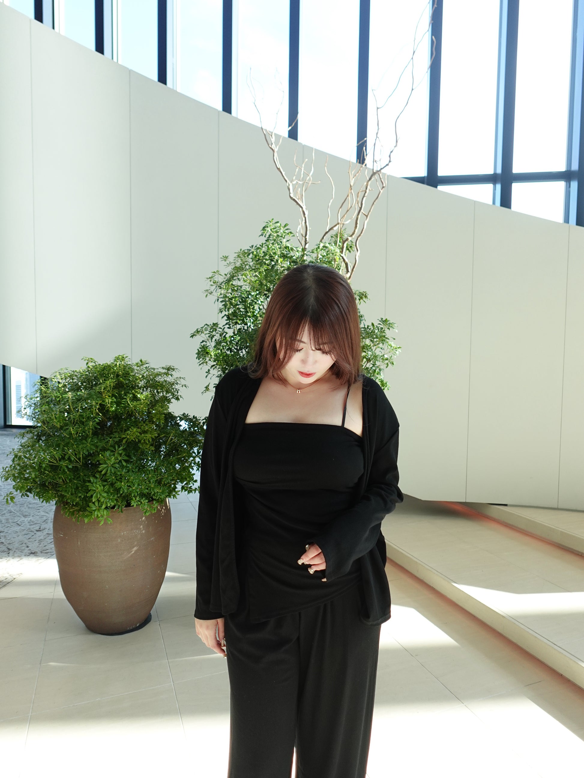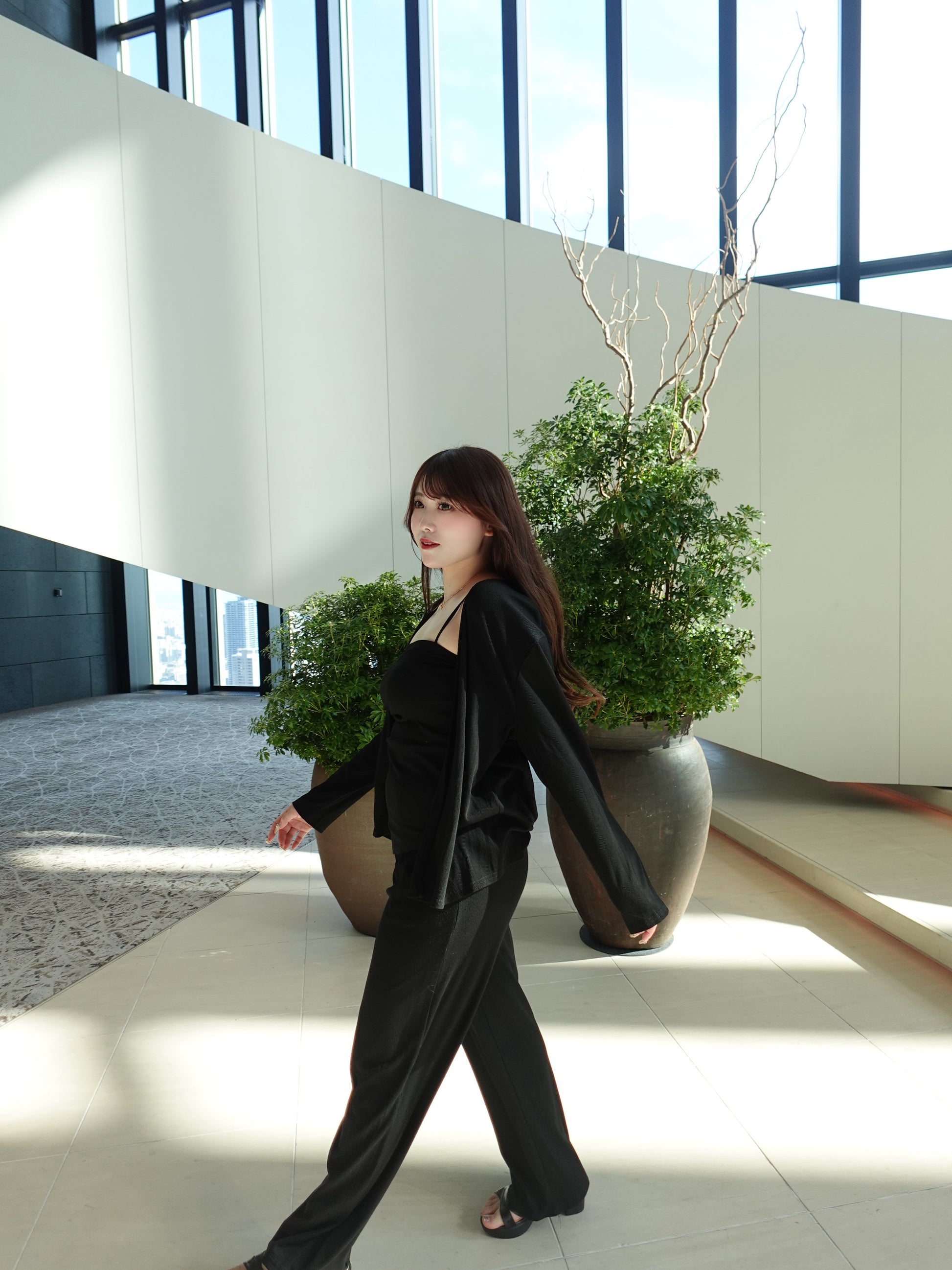 カーディガン・キャミソール・パンツの3点が揃った、エフォートレスに着こなせるセットアップ。