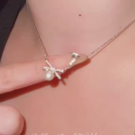 上品なリボンモチーフに、淡水パールをあしらったネックレス。